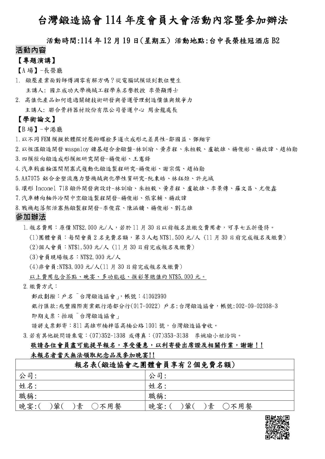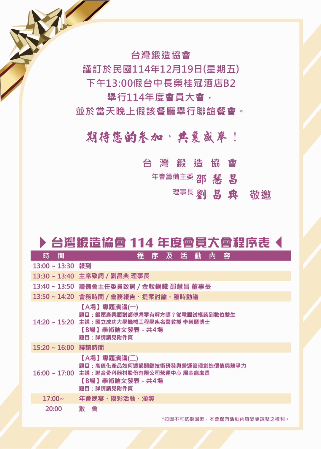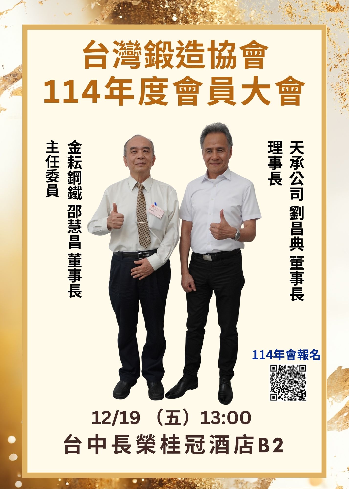 114年12月19日(五)台灣鍛造協會114年度會員大會,誠摯邀請您來共襄盛舉~~~