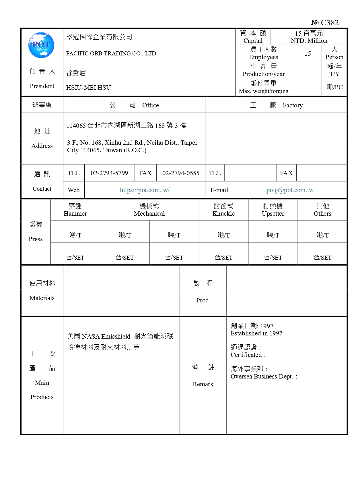 PACIFIC ORB TRADING CO., LTD. 114065台北市內湖區新湖二路168號3樓 TEL:02-2794-5799 potg@pot.com.tw https://pot.com.tw/
