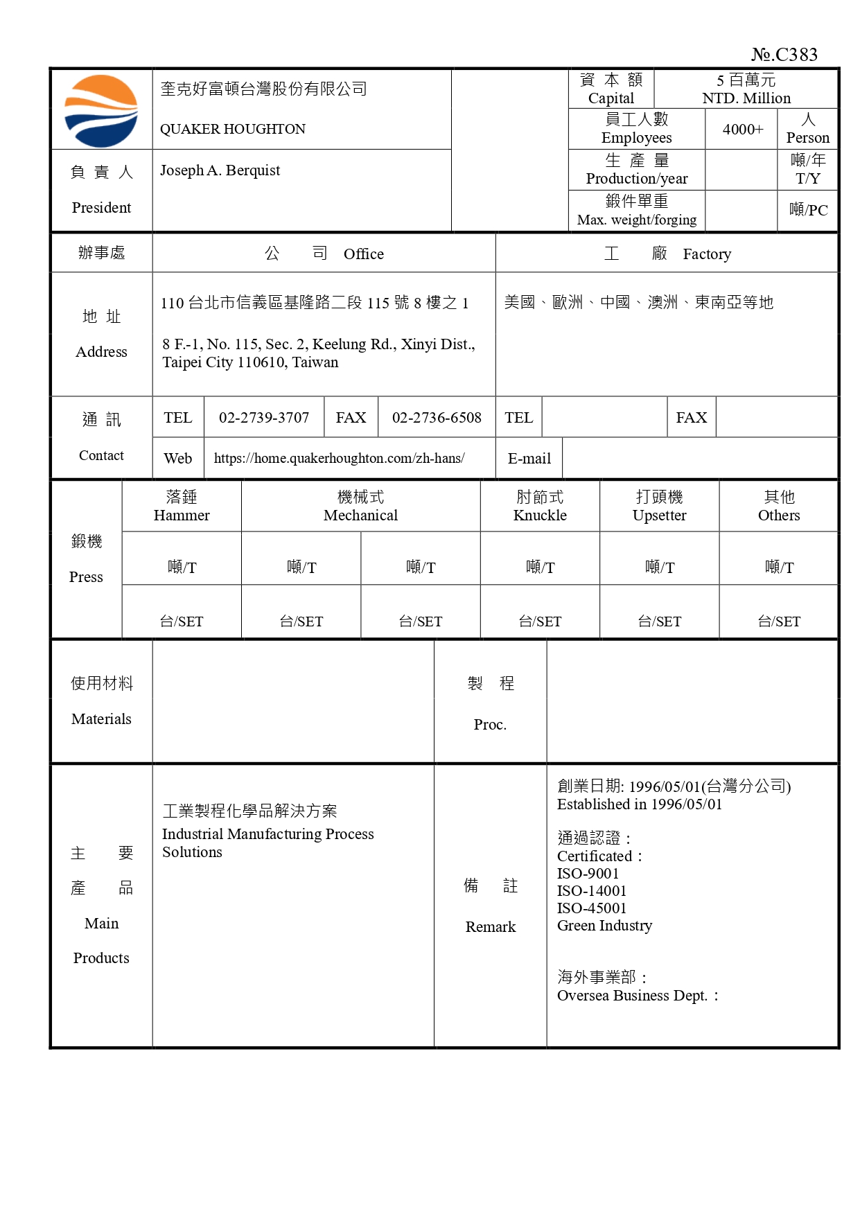 Quaker Houghton 台北市信義區基隆路二段115號8樓之1 TEL:02-2739-3707 FAX:02-2736-6508 Web:quakerhoughton.com E-mail:kai.on@quakerhoughton.com